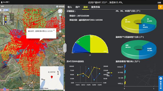 基于GIS地圖的沙盤(pán)式管理理念,依托于百度地圖的地理信息,結(jié)合武漢移動(dòng)已有的業(yè)務(wù)數(shù)據(jù),億信BI實(shí)現(xiàn)了對(duì)武漢移動(dòng)各區(qū)域市場(chǎng)、企業(yè)客戶(hù)、渠道網(wǎng)點(diǎn)的集中管理和實(shí)時(shí)監(jiān)控,真正實(shí)現(xiàn)了企業(yè)的沙盤(pán)式管理思想。
