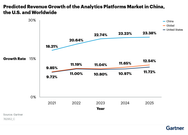 報告指出:中國分析平臺市場規(guī)模將持續(xù)增長。在數(shù)字化轉(zhuǎn)型趨勢、自助服務(wù)、增強分析以及商業(yè)智能解決方案的推動下,到2023年,整體分析采用率將從35%增加到50%。預計到2025年,中國分析平臺市場規(guī)模將達到16億美元,市場增長率將由18.21%提升到23.38%,是全球(12.54%)和美國(11.72%)市場預期增長的兩倍左右。