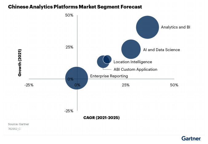 在《指南》中,Gartner對數(shù)據(jù)分析平臺的能力做了進一步的定義,包括了:企業(yè)報告平臺、ABI平臺、AI和數(shù)據(jù)科學平臺、ABI定制化應(yīng)用和位置智能平臺等方向。而在這些細分市場中,增長最快的領(lǐng)域是ABI平臺、AI和數(shù)據(jù)科學平臺,預計復合年增長率分別為36.23%和27.72%。