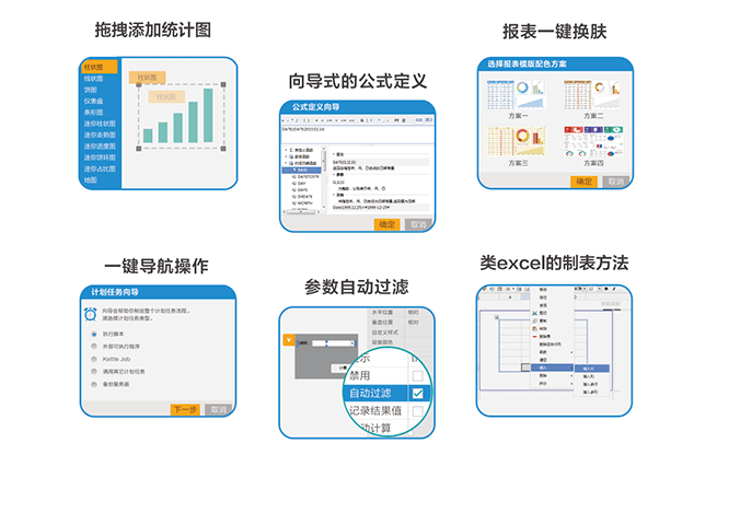 純Web的報表設(shè)計(jì)器,類Excel的操作方式,所有操作無需定義復(fù)雜公式,僅需拖拉圖表、參數(shù),指標(biāo)拾取即可快速完成各類報表。