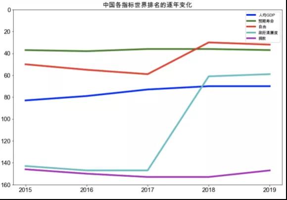 由可以看出,在所有國家中,幸福指數排名上升最快的國家是貝寧共和國,2015年到2019年間,從155升至102。而下降最快的是委內瑞拉,世界排名從23驟降到108。中國的變化較為平穩,一直處于80~90名左右。經過查閱相關資料可發現,近年來委內瑞拉經濟崩潰,通貨膨脹嚴重,民不聊生,食不果腹,因此其幸福指數必然暴跌。