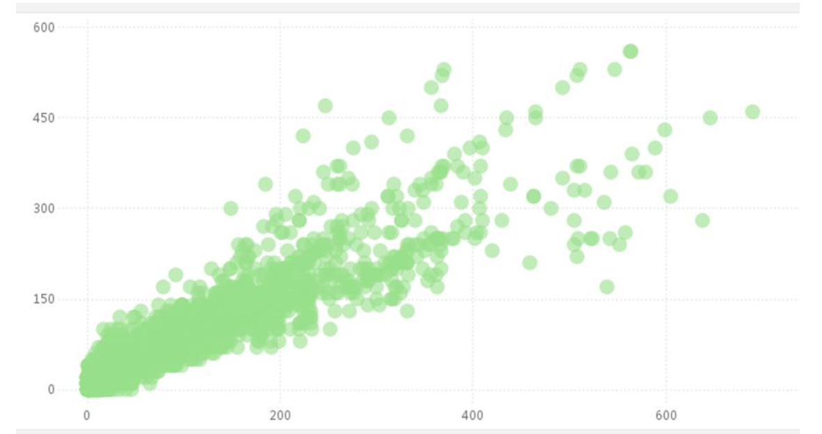 散點(diǎn)圖可以顯示數(shù)據(jù)集群的形狀,分析數(shù)據(jù)的分布。通過觀察散點(diǎn)的分布,可以推斷變量的相關(guān)性。